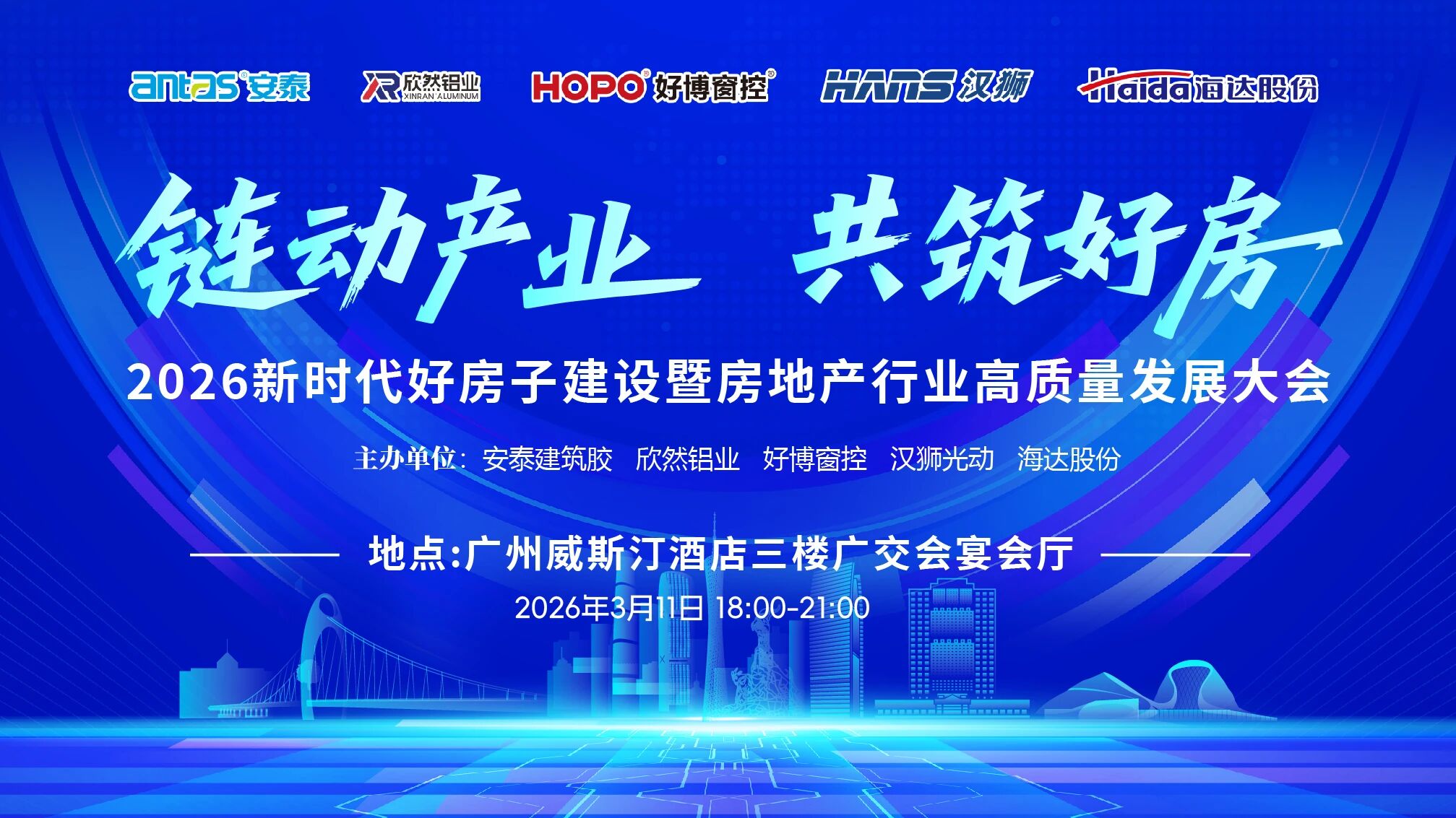 春风和畅,万象更新。3月11日,正值第32届广州门窗幕墙展如火如荼举办之际,一场聚焦产业升级、凝聚行业智慧的盛会备受瞩目——"链动产业 共筑好房"2026新时代好房子建设暨房地产行业高质量发展大会圆满举行。本次大会由中国幕墙网权威指导,广州集泰化工股份有限公司、安徽欣然新材料有限公司、深圳好博窗控技术股份有限公司、汉狮光动科技(广东)有限公司、江阴海达橡塑股份有限公司联合承办,汇聚了500余位行业领军人物及头部企业代表,共探房地产与门窗幕墙产业的高质量发展路径。