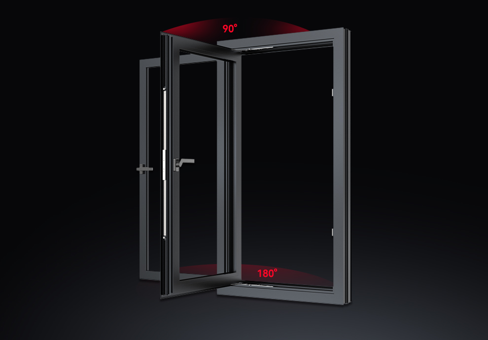 玻扇外开90°,纱扇内开180°