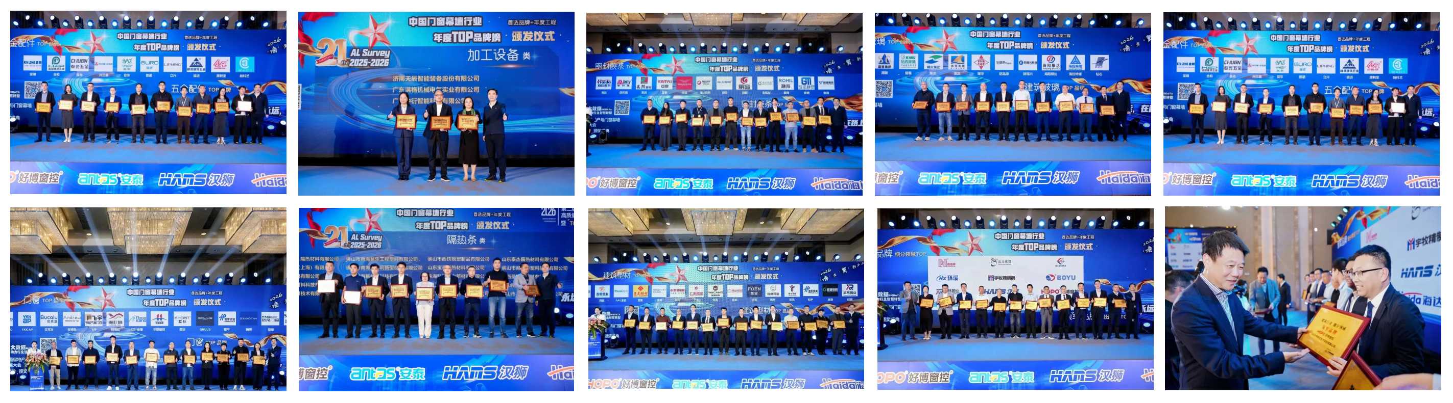 大会特别设置了「TOP品牌」颁奖盛典,从建筑胶、玻璃、加工设备到隔热条、密封胶条,从细分领域领军品牌到行业自媒体TOP人物,十项年度大奖重磅揭晓,全面展现中国门窗幕墙行业的中坚力量。HOPO好博窗控作为门窗幕墙领域的核心代表,与上下游伙伴共同见证行业卓越者的荣耀时刻,并凭借突出实力荣膺建筑行业细分领域“领军品牌”称号,以品牌力量赋能行业高质量发展,共筑美好人居。