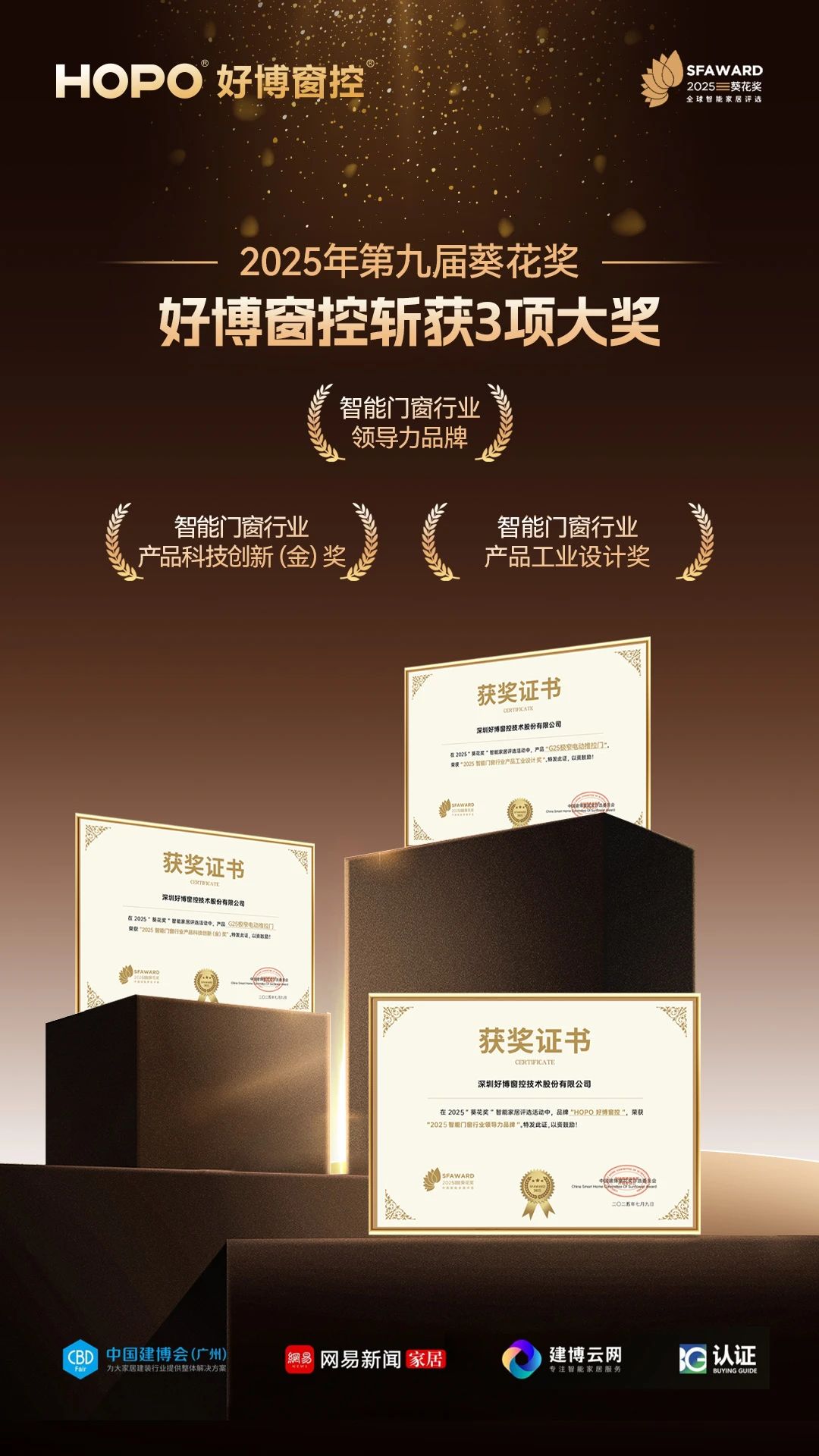 在备受瞩目的评选中,HOPO好博窗控一举斩获“葵花奖”三项重量级大奖: