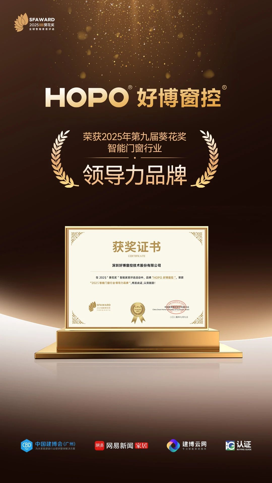 此次加冕,不仅彰显了HOPO好博窗控在智能门窗领域的领先地位与深厚技术底蕴,更是对其持续推动行业进步与创新发展的权威认可。这份殊荣,激励我们笃行不怠,再攀高峰!